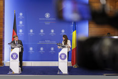 Johann Wadephul (CDU), Bundesaussenminister, und Oana Toiu, Ministerin des Auswaertigen von Rumaenien, aufgenommen im Rahmen einer Begegnung mit der Presse in Bukarest, 14.10.2025. Fotografiert im Auftrag des Auswaertigen Amtes.