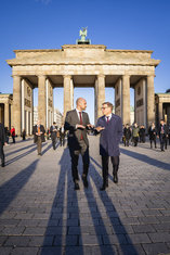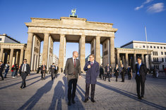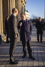 Stichworte: Politik politics Johann Wadephul Jean-Noel Barrot meeting Berlin Brandenburger Tor zu zweit two people Abendsonne Sonnenuntergang sunset golden hour goldene Stunde ganze Figur whole figure