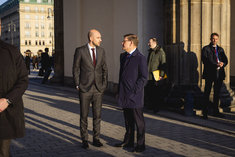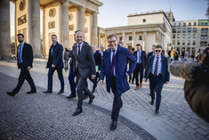 Stichworte: Politik Politics Politiker Politician Bundeskanzleramt Kanzleramt Chancellery ganze Figur whole figure Ganzfigur full figure gehend gehende gehender gehendes gehen geht laufen laeuft going running running Militaer Military Militaerische Ehren Military honors sieht nach rechts looks to the right