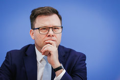 Stichworte: Politik Politics Bundespressekonferenz bpk Federal Press Conference Politiker Politician Portraet Portrait Halbe Figur Halbfigur half-length waist up Anschnitt gate Frontal Von Vorne front view neutraler Hintergrund neutral background Freisteller freistellbar Textfreiraum Text freier Raum Copyspace Copy Space Text Blank sitzend sitzende sitzender sitzendes sitzen sitzt sitting sieht nach rechts looks to the right