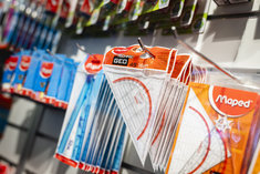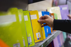 Symbolbild: Schulanfang. Eine Person nimmt ein Schulheft aus einem Regal. Aufgenommen im Rahmen der didacta Bildungsmesse in Koeln, 10.03.2026.