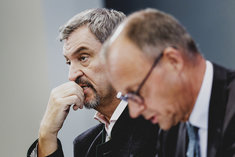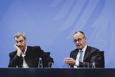 Caption: Pressekonferenz nach Koalitionsausschuss(R-L) Friedrich Merz (CDU), Bundeskanzler, und Markus Soeder, Ministerpraesident von Bayern, aufgenommen im Rahmen einer Pressekonferenz nach der Sitzung vom Koalitionsausschuss in Berlin, 03.09.2025.