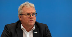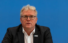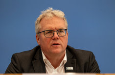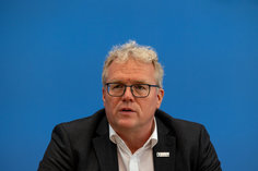Dirk Flege, Geschaeftsfuehrer Allianz pro Schiene e. V., aufgenommen in der Bundespressekonferenz zum Thema Bahnstrategie des Bundes und Beitrag der Branche zum Nahverkehr in Berlin, 22.09.2025.