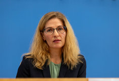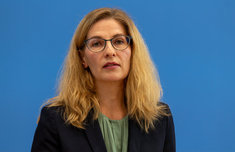 Sarah Stark, Hauptgeschaeftsfuehrerin des Verbands der Bahnindustrie in Deutschland e.V. (VDB), aufgenommen in der Bundespressekonferenz zum Thema Bahnstrategie des Bundes und Beitrag der Branche zum Nahverkehr in Berlin, 22.09.2025.