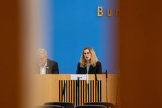 (L-R) Dirk Flege, Geschaeftsfuehrer Allianz pro Schiene e. V. und Sarah Stark, Hauptgeschaeftsfuehrerin des Verbands der Bahnindustrie in Deutschland e.V. (VDB), aufgenommen in der Bundespressekonferenz zum Thema Bahnstrategie des Bundes und Beitrag der Branche zum Nahverkehr in Berlin, 22.09.2025.