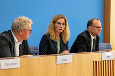 (L-R) Dirk Flege, Geschaeftsfuehrer Allianz pro Schiene e. V. und Sarah Stark, Hauptgeschaeftsfuehrerin des Verbands der Bahnindustrie in Deutschland e.V. (VDB), Tim Szent-Ivanyi, Bundespressekonferenz, aufgenommen in der Bundespressekonferenz zum Thema Bahnstrategie des Bundes und Beitrag der Branche zum Nahverkehr in Berlin, 22.09.2025.