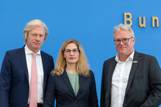 (L-R) Jan Goernemann, Geschaeftsfurhrer Bundesverband SchienenNahverkehr e.V. (BSN), Sarah Stark, Hauptgeschaeftsfuehrerin des Verbands der Bahnindustrie in Deutschland e.V. (VDB) und Dirk Flege, Geschaeftsfuehrer Allianz pro Schiene e. V., aufgenommen in der Bundespressekonferenz zum Thema Bahnstrategie des Bundes und Beitrag der Branche zum Nahverkehr in Berlin, 22.09.2025.