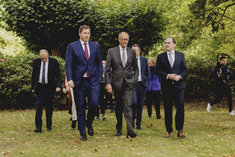 Stichworte: Politik politics kabinettsklausur bundeskanzler sieht nach links looks to the left Portraet Portrait head headshot Querformat QF Horizontal Halbe Figur Halbfigur half-length waist up Anschnitt gate gehend gehende gehender gehendes gehen geht laufen laeuft going running