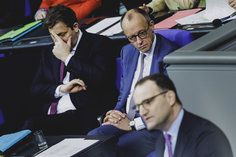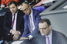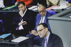 Caption: Sitzung des Deutsches Bundestages(R-L) Jens Spahn, Vorsitzender der CDU/CSU-Fraktion im Deutschen Bundestag, Friedrich Merz (CDU), Bundeskanzler, und Lars Klingbeil, Bundesminister der Finanzen, aufgenommen im Rahmen der Debatte zur Regierungserklaerung im Deutschen Bundestag in Berlin, 29.01.2026.