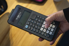 Caption: BildungSymbolbild: Eine Person haelt einen Taschenrechner in der Hand. Aufgenommen im Rahmen der didacta Bildungsmesse in Koeln, 10.03.2026.