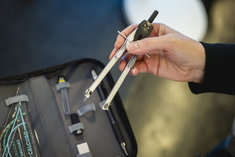 Caption: BildungSymbolbild: Eine Person haelt einen Zirkel in der Hand. Aufgenommen im Rahmen der didacta Bildungsmesse in Koeln, 10.03.2026.