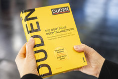 Caption: Deutsche Rechtschreibung - DudenSymbolbild: Eine Person haelt einen Duden in der Hand. Aufgenommen im Rahmen der didacta Bildungsmesse in Koeln, 10.03.2026.