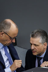 Caption: Bundeskanzler Merz mit Thorsten FreiFriedrich Merz (CDU), Bundeskanzler, und Thorsten Frei (CDU), Chef des Bundeskanzleramtes, aufgenommen im Deutschen Bundestag in Berlin, 23.09.2025.