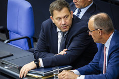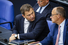 Caption: Lars Klingbeil, Friedrich MerzLars Klingbeil, Bundesminister der Finanzen, und Friedrich Merz (CDU), Bundeskanzler, sitzen auf der Regierungsbank im Bundestag. Berlin, 26.09.2025.