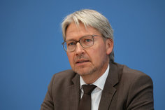 Stichworte: Portraet Portrait head headshot Bundespressekonferenz bpk Federal Press Conference sieht nach links looks to the left querformat QF Horizontal neutraler Hintergrund neutral background sprechend sprechen spricht sprechende sprechender sprechendes Talking Mimik Facial expressions ernst ernste serious textfreier Raum Textfreiraum Text freier Raum Copyspace Copy Space Text Blank