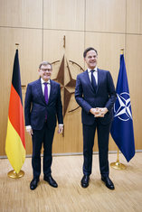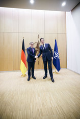 Caption: Johann Wadephul in BruesselJohann Wadephul (CDU), Bundesaussenminister, trifft Mark Rutte, NATO-Generalsekretaer zu einem Gespraech im NATO-Hauptquartier in Bruessel, 27.10.2025. Fotografiert im Auftrag des Auswaertigen Amtes (AA)