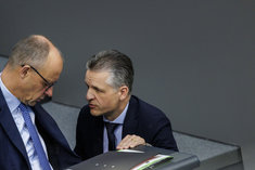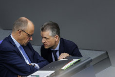 Caption: Bundeskanzler Merz mit Thorsten FreiFriedrich Merz (CDU), Bundeskanzler, und Thorsten Frei (CDU), Chef des Bundeskanzleramtes, aufgenommen im Deutschen Bundestag in Berlin, 23.09.2025.