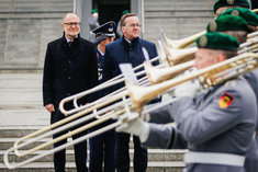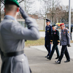Stichworte: Politik Politics Politiker Politician Militaer Military Bundeswehr German Army Bundeswehr Militaerische Ehren Military honors Portraet Portrait ganze Figur whole figure Ganzfigur full figure Frontal Von Vorne front view Begruessung greeting laecheln laechelt laechelnd smile smiles smiling sieht nach links looks to the left
