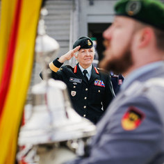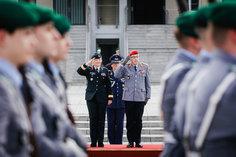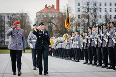 Stichworte: Politik Politics Politiker Politician Militaer Military Bundeswehr German Army Bundeswehr Militaerische Ehren Military honors Wachbataillon Soldat Soldaten Soldier soldiers Soldatin Soldatinnen female Soldier female soldiers Portraet Portrait Halbe Figur Halbfigur half-length waist up Anschnitt gate Frontal Von Vorne front view sieht nach links looks to the left Blick in die Kamera Looking At Camera