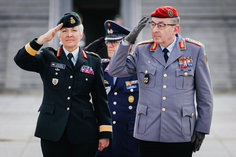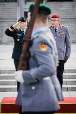 Stichworte: Politik Politics Politiker Politician Militaer Military Bundeswehr German Army Bundeswehr Militaerische Ehren Military honors Portraet Portrait Halbe Figur Halbfigur half-length waist up Anschnitt gate Frontal Von Vorne front view sieht nach rechts looks to the right