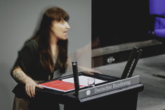 Caption: Bundestag beraet ueber RentenpaketHeidi Reichinnek, Mitglied des Deutschen Bundestages (Die Linke), aufgenommen im Rahmen der Debatte ueber das Rentenpaket im Deutschen Bundestag in Berlin, 05.12.2025. Die Junge Gruppe der CDU/CSU-Fraktion droht mit Ablehnung des Paketes, was zu einer Krise der Koalition fuehren koennte.