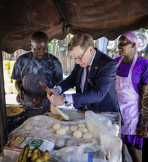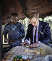 Caption: Reise BM Wadephul nach AfrikaJohann Wadephul (CDU), Bundesaussenminister, aufgenommen am Rande seiner Reise nach Kenia. Hier besucht der Minister eine Kibanda, dies sind einfache, informelle Essensstaende oder kleine Straßenrestaurants und uebt sich im Ausrollen eines Teigs fuer ein Chapati Fladenbrot. 'Fotografiert im Auftrag des Auswaertigen Amtes'