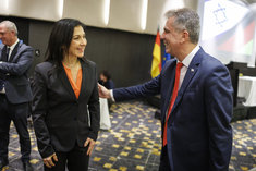 Caption: BM Reiche reist nach IsraelKatherina Reiche (CDU), Bundesministerin fuer Wirtschaft und Energie, reist nach Israel. Hier bei einer Rede auf dem Jahrestreffen der Leiter der Wirtschaftsabteilungen israelischer Botschaften . Rechts der Wirtschaftsminister von Israel Nir Barkat. Jerusalem, 16.12.2025 Fotografiert im Auftrag des BMWE