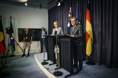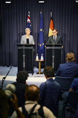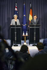 Johann Wadephul (CDU), Bundesaussenminister, bei einer gemeinsamen Pressekonferenz mit der Ministerin für Auswaertige Angelegenheiten von Australien, Frau Penny Wong in Canberra, 05.02.2026. Fotografiert im Auftrag des Auswaertigen Amtes.