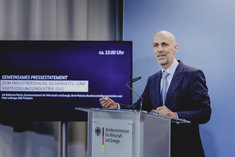 Stichworte: Politik Politics Bundespressekonferenz bpk Federal Press Conference Portraet Portrait neutraler Hintergrund neutral background Freisteller freistellbar Frontal Von Vorne front view Halbe Figur Halbfigur half-length waist up Anschnitt gate stehend stehende stehender stehendes stehen steht standing stands sieht nach links looks to the left