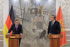 Caption: Aussenminister Wadephul reist in den westlichen BalkanJohann Wadephul (CDU), Bundesaussenminister, und Ervin Ibrahimovic, Aussenminister von Montenegro, aufgenommen im Rahmen einer Pressekonferenz in Podgorica, 17.11.2025. Fotografiert im Auftrag des Auswaertigen Amtes.