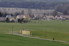 Eine Person laeuft am Rande eines Dorfes auf einer schmalen Strasse in Wiesa, 10.04.2026.