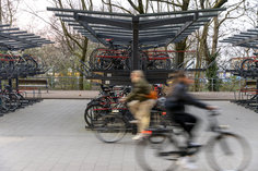 Caption: Ueberdachter Parkplatz fuer FahrraederUeberdachter Parkplatz fuer Fahrraeder. Hamburg, 19.03.2026.