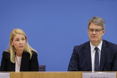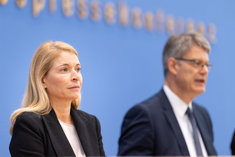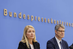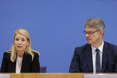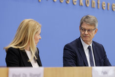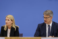 Caption: Evelyn Palla mit Verkehrsminister SchniederEvelyn Palla, Designierte Konzernchefin der Deutschen Bahn, und Patrick Schnieder (CDU), Bundesminister fuer Verkehr, aufgenommen im Rahmen der Bundespressekonferenz in Berlin, 22.09.2025.