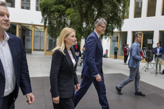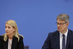 Caption: Evelyn Palla mit Verkehrsminister SchniederEvelyn Palla, Designierte Konzernchefin der Deutschen Bahn, und Patrick Schnieder (CDU), Bundesminister fuer Verkehr, aufgenommen vor der Bundespressekonferenz in Berlin, 22.09.2025.