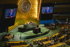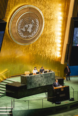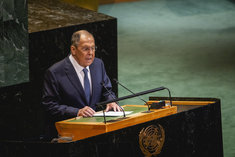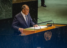 Caption: Russlands Aussenminister Lawrow bei UNSergei Wiktorowitsch Lawrow, Aussenminister Russlands, spricht bei der 80. Vollversammlung der Vereinten Nationen in New York City, 27.09.2025.