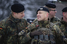 Stichworte: Feature Symbolfoto Symbolbild Symbol picture symbol image Symbol Symbole Symbolisch symbols symbolic Militaer Military Bundeswehr German Army Bundeswehr Streitkraefte Streitkraft Armed forces armed force Armee Army Militaereinsatz Militaereinsaetze Military deployment military operations Nato North Atlantic Treaty Organization Ostflanke eastern flank Verteidigung defense defence Soldat Soldaten Soldier soldiers Junge Maenner maennlich maennlicher Young Men Males Zwei Personen Zwei Menschen Two People Plattentraeger Magazine vest flack jacket barett Dienstgrad Hauptmann Captain Uniform Flecktarn Feldanzug