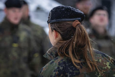 Stichworte: Feature Symbolfoto Symbolbild Symbol picture symbol image Symbol Symbole Symbolisch symbols symbolic Militaer Military Bundeswehr German Army Bundeswehr Streitkraefte Streitkraft Armed forces armed force Armee Army Militaereinsatz Militaereinsaetze Military deployment military operations Nato North Atlantic Treaty Organization Ostflanke eastern flank Verteidigung defense defence Flecktarn Feldanzug Wehrdienst Wehrpflicht national service wehrpflichtig Dienst duty Winter kalt cold Schnee snow Soldatin Soldatinnen female Soldier female soldiers Zugfuehrerin Anfuehrerin Frau in Fuehrungsposition female leadership von hinten back Zopf ponytail