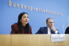 Caption: Reem Alabali-Radovan - Carsten SchneiderReem Alabali-Radovan (SPD), Bundesministerin fuer wirtschaftliche Zusammenarbeit und Entwicklung, und Carsten Schneider (SPD), Bundesminister fuer Umwelt, Klimaschutz, Naturschutz und nukleare Sicherheit, bei einer Pressekonferenz zum Thema: Deutschlands und Europas Beitrag zur Weltklimakonferenz in Brasilien - Berlin, 05.11.2025. Fotografiert im Auftrag des Bundesentwicklungsministeriums