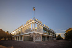 Caption: Cafe MoskauDas Cafe Moskau wird am fruehen Morgen von der aufgehenden Sonne beschienen. Berlin, 25.09.2025.