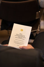 Caption: Program des TagesVeranstaltung im Schloss Bellevue zum 100.Todestag von Hugo Preuss in Berlin, 26.09.2025.