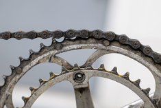 Caption: FahrradKettenblatt mit Kette an einem Rennrad. Berlin, 11.03.2026.
