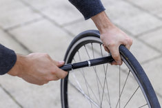 Caption: FahrradAufpumpen eines Hinterrades bei einem Fahrrad. Berlin, 11.03.2026.