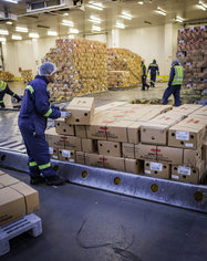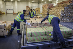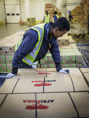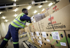 Caption: Frachtterminal Ethiopian AirlinesVerladung von Schnittblumen am Frachtterminal von Ethiopian Airlines am Flughafen in Addis Abeba. Im Schnitt werden von hier rund 180 Tonnen Blumen am Tag nach Europa exportiert.