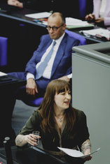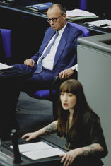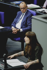 Caption: Sitzung des Deutsches Bundestages(L-R) Friedrich Merz (CDU), Bundeskanzler, und Heidi Reichinnek, Mitglied des Deutschen Bundestages (Die Linke), aufgenommen im Rahmen der Debatte zur Regierungserklaerung im Deutschen Bundestag in Berlin, 18.03.2026.