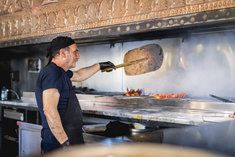 Caption: Kebab Restaurant in der TuerkeiSymbolbild zum Thema Gastronomie. Ein Mann braet Gemuese und Fleisch ueber einem Holzkohlegrill in einem Restaurant in Ankara, 17.10.2025.