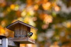 Caption: Kohlmeise im HerbstKohlmeise in einem Vogelhaus im herbstlichen Berlin, 20.10.2025.
