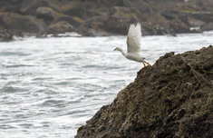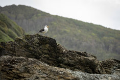 Caption: Chile, PatagonienMoewe sitzt auf dunklem Kuestenfelsen; dahinter gruene Huegel/vegetierte Kueste bei bedecktem Himmel (Chiloe, Chile/Patagonien). Chiloe, 14.12.2025.