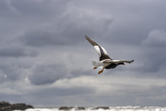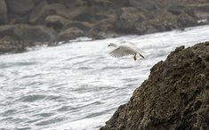 Stichworte: Chile Chiloe Isla de Chiloe Patagonien Suedchile Pazifik Caranca Kelp Goose Chloephaga hybrida Gans Wildgans Wasservogel Maennchen weiss Vogel im Flug Fluegelschlag Aktion Start Wildtier Kueste Felsen Kuestenfelsen Brandung Wellen Meer Natur Dynamik