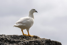 Caption: Chile, PatagonienKelp Gans (Chloephaga hybrida) steht auf dunklem Kuestenfelsen, seitliches Profil vor hellem, bedecktem Himmel (viel Freiraum). Chiloe, 14.12.2025.