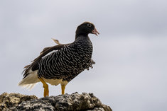 Caption: Chile, PatagonienKelp Gans (Chloephaga hybrida) – graues Weibchen auf Kuestenfelsen auf Chiloe (Chile, Patagonien), seitliches Profil vor hellem Himmel. Chiloe, 14.12.2025.